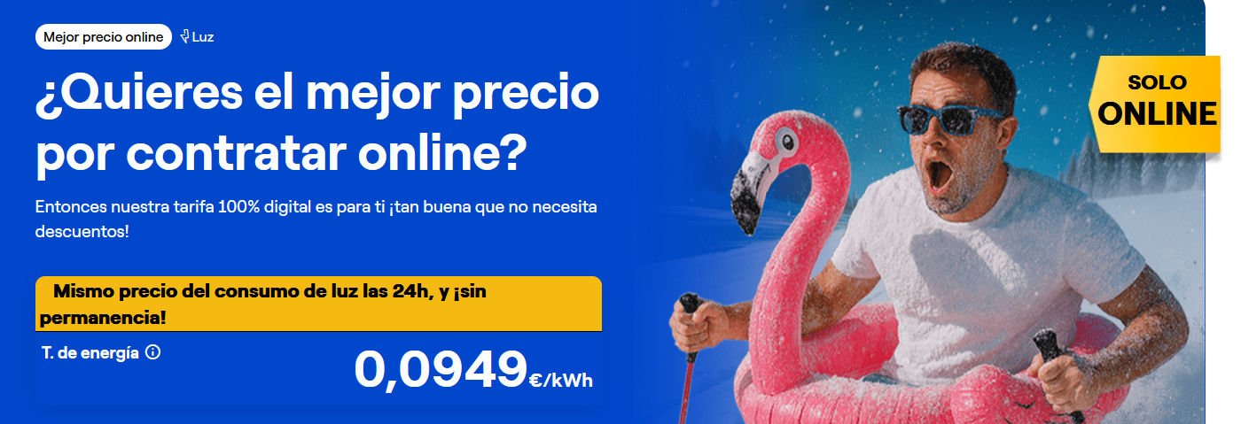 0.0949€/kWh+impuestos. ENDESA Tarifa conecta, para nuevos clientes. Solo online. Mismo precio las 24h. Sin permanencia.