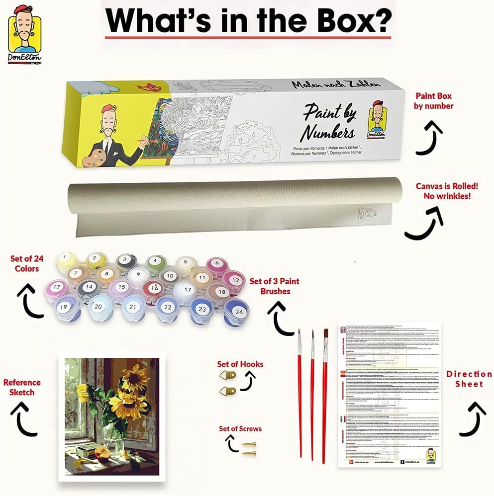 -48% 10,39€ AMAZON DonElton Pintar por Números – 40×50 cm Kits de pintura con Pinceles, colores acrílicos y lienzo de lino, Sin marco – Regalo creativo (Girasol). Hasta el 22nov.