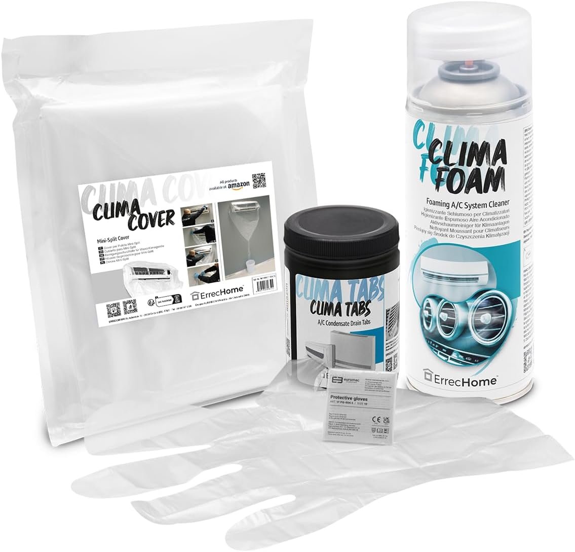-80% 11,74€ – AMAZON – Kit de limpieza de aire acondicionado, incluye Clima Foam Limpiador espumoso, funda protectora Clima Cover, Clima Tabs 40 pastillas para aire acondicionado de acción prolungada, guantes